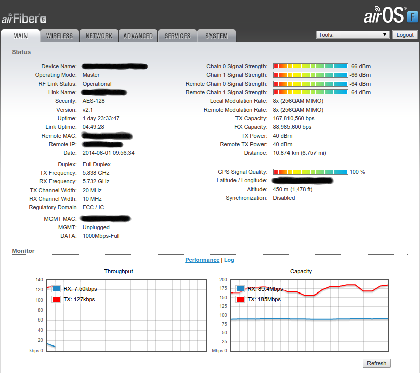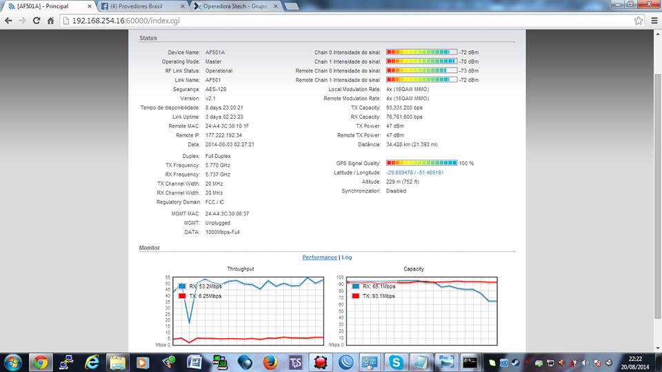 Vale ressaltar que este enlace de AF5 esta substituindo um enlace de RB800 + R52Hn + ALGCom de 30dBi que esta excelente passando 200Mb em teste e 150Mb efetivo de Link + Upload.