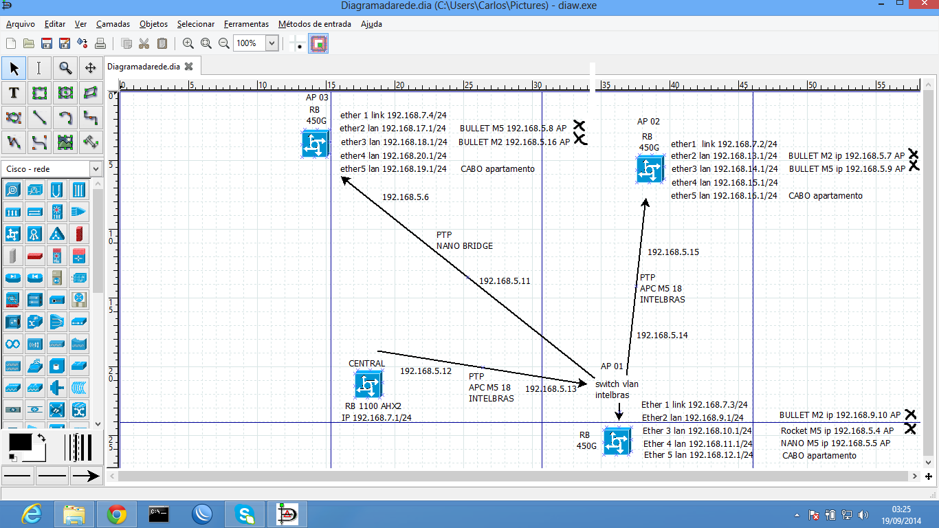 *do switch vlan intelbras do 1ª apartamento sai mais um PTP , no PTP do apartamento 3 um par de bridge 26 onde recebe o link em uma rb 450g na porta ether1, ether2 um bullet M2 AP, ether 3 um bullet M5 AP E ether5 cabo para o apartamento.