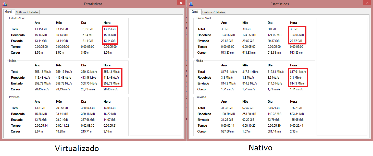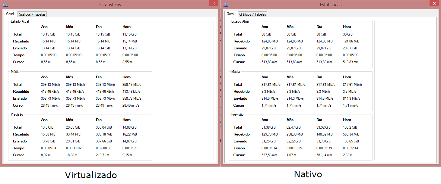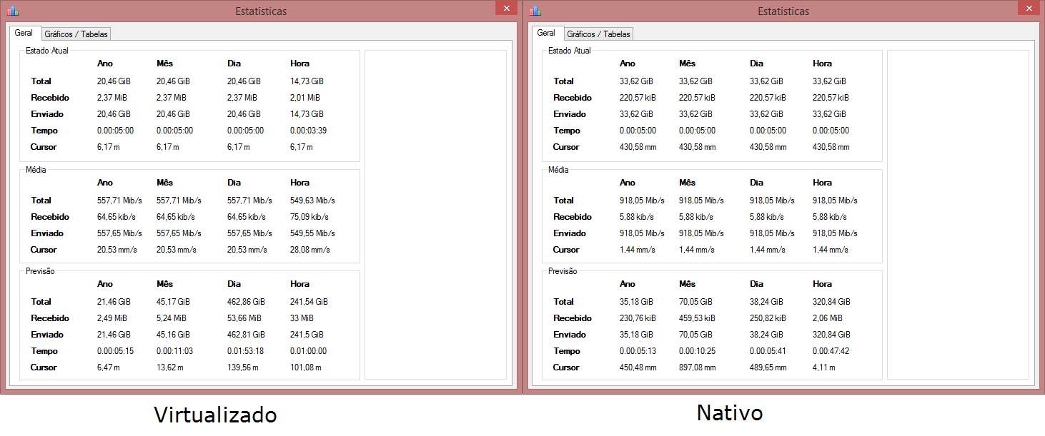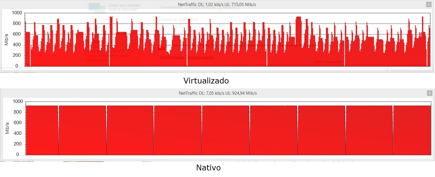 Aqui em ambos os testes houveram muitas oscilações, mas novamente o sistema nativo se comportou muito melhor que o sistema virtualizado. Em download, o sistema nativo foi 452.51% mais rápido, e em upload 649.14% mais rápido. Calculando o bandwidth total vemos uma diferença de 592.07%. Novamente, a instabilidade do gráfico do sistema virtualizado chama a atenção.