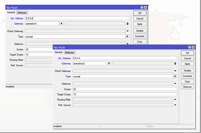 Código :add dst-address=0.0.0.0/0 gateway=192.168.10.1 distance=1 check-gateway=ping add dst-address=0.0.0.0/0 gateway=192.168.20.1 distance=2 check-gateway=ping