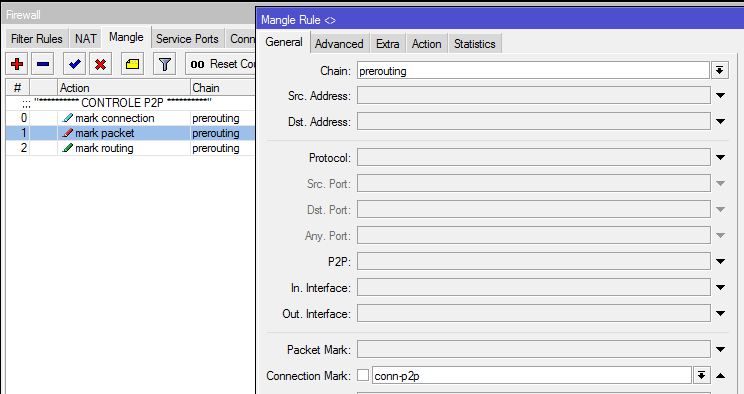 Código :/ ip firewall mangle add chain=prerouting p2p=all-p2p action=mark-connection new-connection-mark=conn-p2p passthrough=yes comment="********** CONTROLE P2P **********" add chain=prerouting connection-mark=conn-p2p action=mark-packet new-packet-mark=pacotes-p2p passthrough=yes add chain=prerouting p2p=all-p2p action=mark-routing new-routing-mark=p2p