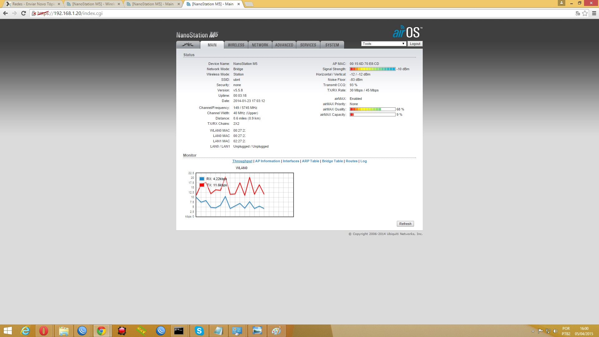 ou ponteira da argrid(no caso da argrid o sinal e outro pois a ponteira dela tem o ganho de 3 dbi o certo e o sinal ficar proximo de -20 se tiver 10 dbi acima disso ela ta com problema de sinal tambem) configure um como ap e o outro como station,verifique do lado da station o sinal, o certo e ficar -1 ou proximo