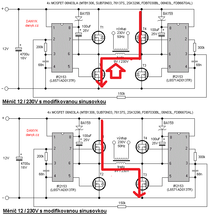 Sobre o inversor já falei, eu não acredito que o motor dê partida direito com uma senoidal apenas "aproximada", e nesse caso tem outro agravante: Os mosfets estão numa ponte H onde a circulação de corrente ocorrerá de maneira intercalada passando por 2 mosfets, assim: