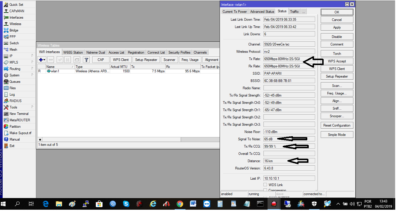 Pois então, uso RouterOS a bastante tempo. Mas sempre usei mais a parte de roteamento, então trabalho com a parte de Rádio mesmo a pouco tempo (2 Anos). Consegui finalizar agora meu enlace AC com um par de 921 + AlgCom de 30 Cm (22Dbi). Um enlace curto de 3,5km.