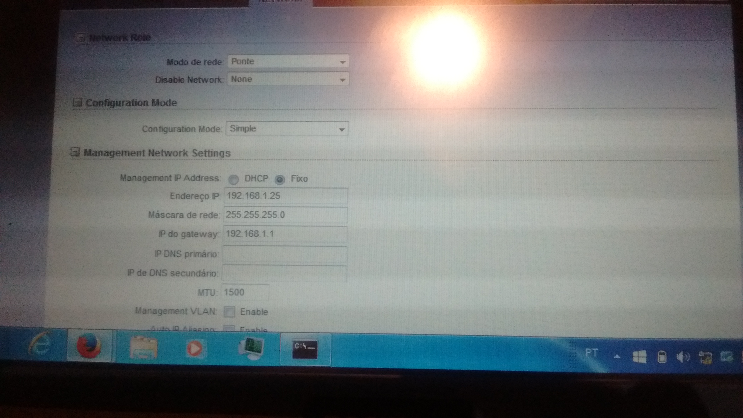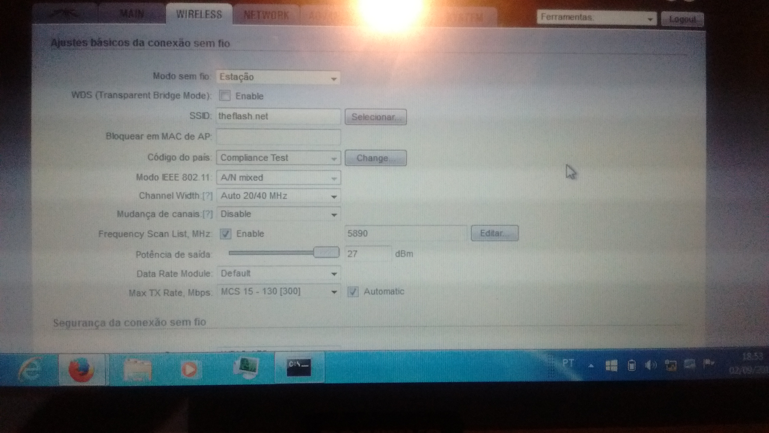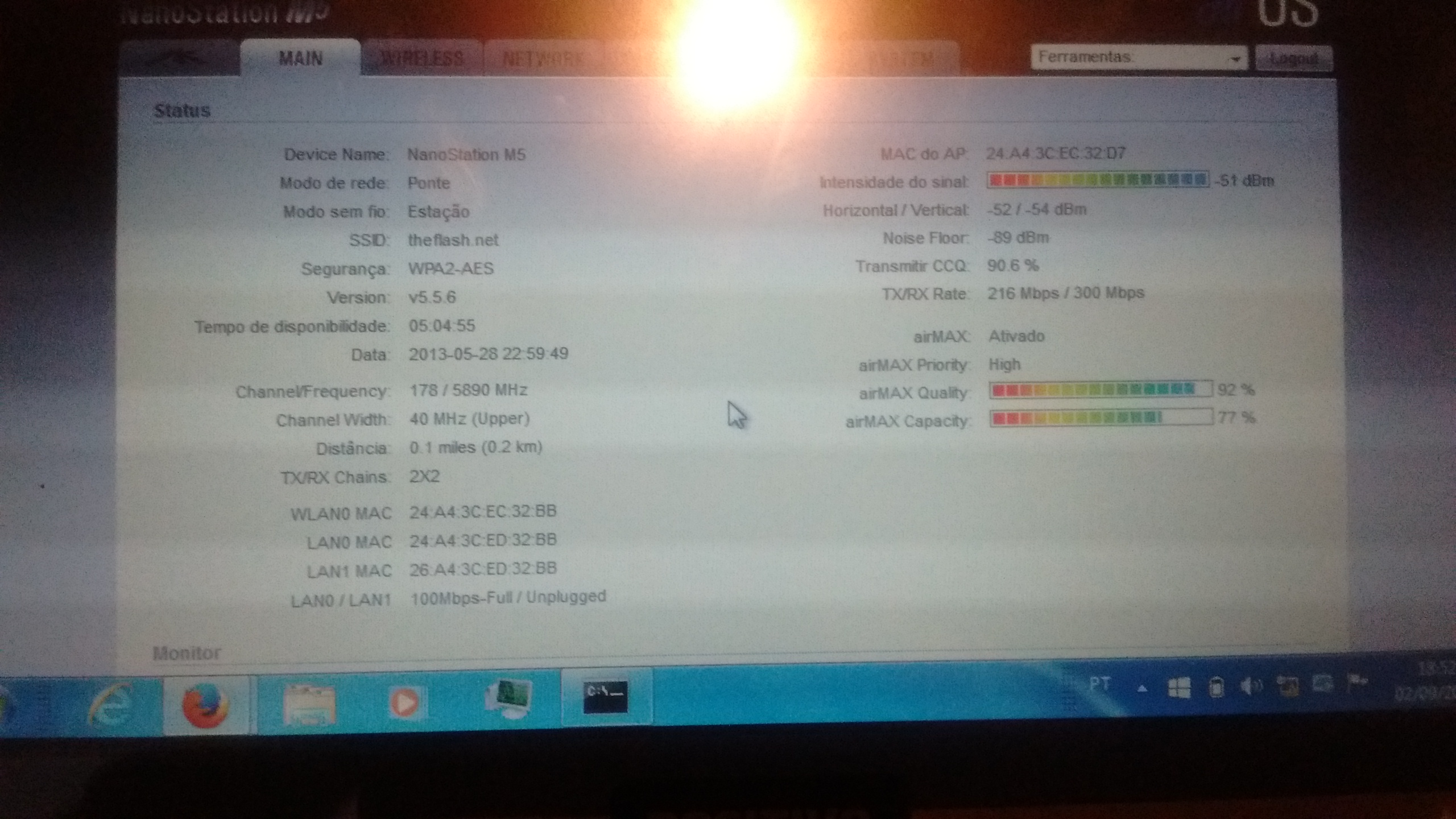 boa noite ? pessoal sou leigo em redes, estou montando um provedor de internet, comprei 2 antenas nano m5, uma como ap e outra como cliente, acho que alguma coisa esta errada nas configurações, pois minha taxa de velocidade informada pelo airos esta 177.74, RX:85.32 TX:92.42,O nose floor fica em no minimo -89, o CCQ fica em torno de 91.6 porcento, minha internet é GVT de 15 megas,ja desbloquiei o modem um sagemcom,configurei ele como bridge e nao aparece interne tno modem,so aparece quando coloco o modem em modo roteador, plugo ele na porta lan 1,2,3,4 e nada de rede na cliente,detalhe tem uma configuraçao no modem para as lans com IP´S e nao sei como,vou mandar foto da configuraçao da antena cliente e peço humildemente ajuda aos caros colegas de trabalho.Clique na imagem para uma versão maior