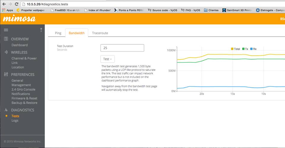Teste de Banda em UDP entre radios com a ferramenta nativa: 1.036 a 1.089Gb.