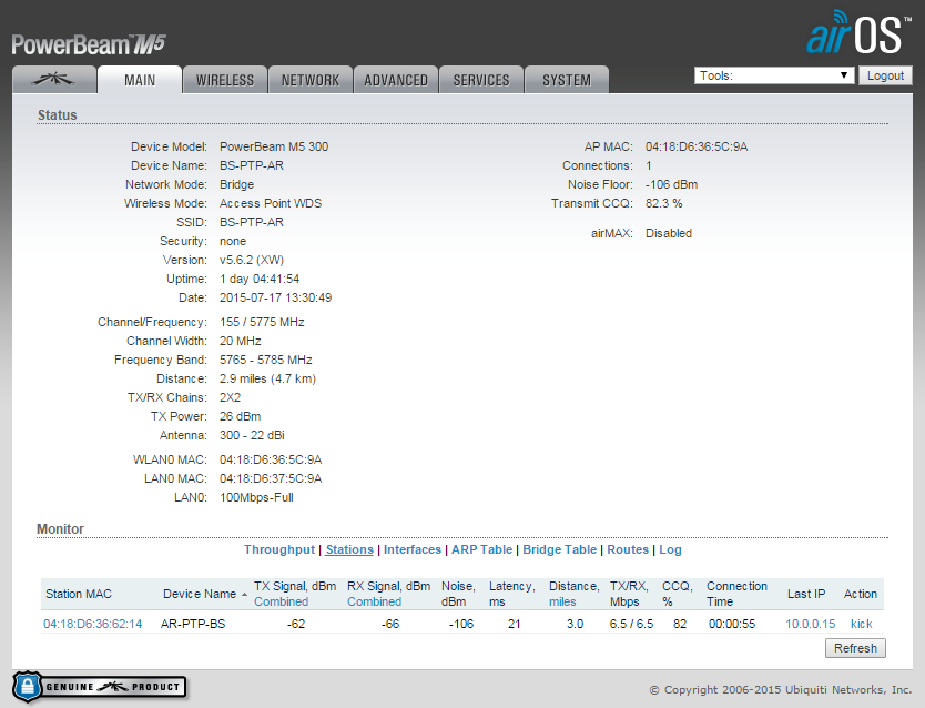 Fechamos um PTP ontem de 3.8km com visada limpa usando um par de PowerBeam M5, pois bem, o mal resultado é exibido na tela abaixo: