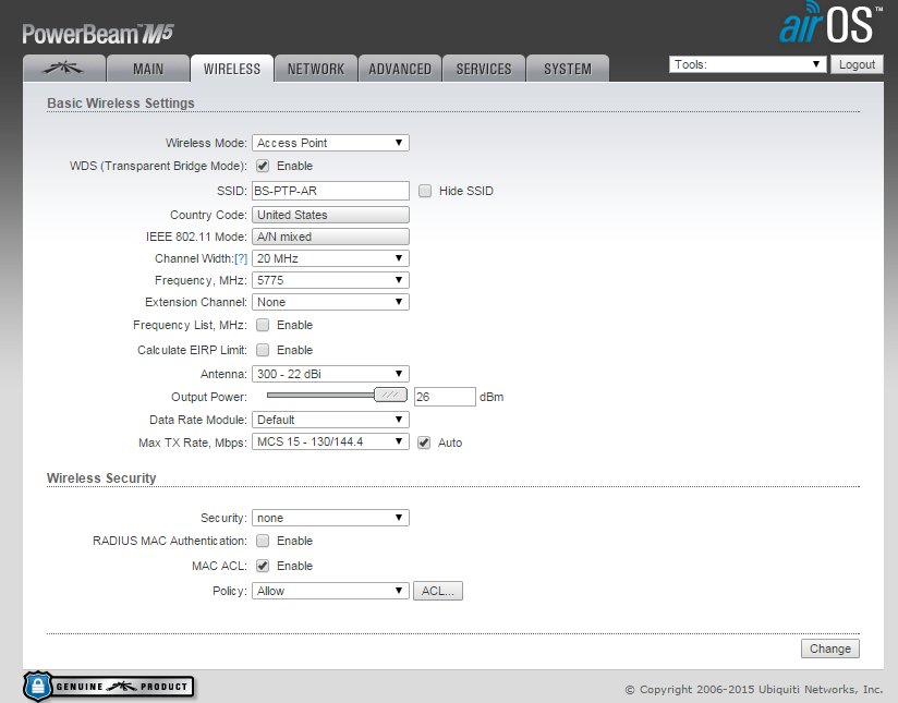 Se você usar o canal 5775MHz, ele vai na verdade de 5765 a 5785MHz, se usar a largura de canal de 20MHz. Você seleciona o CENTRO do canal, e o aparelho usa metade da largura pra cima e metade pra baixo.