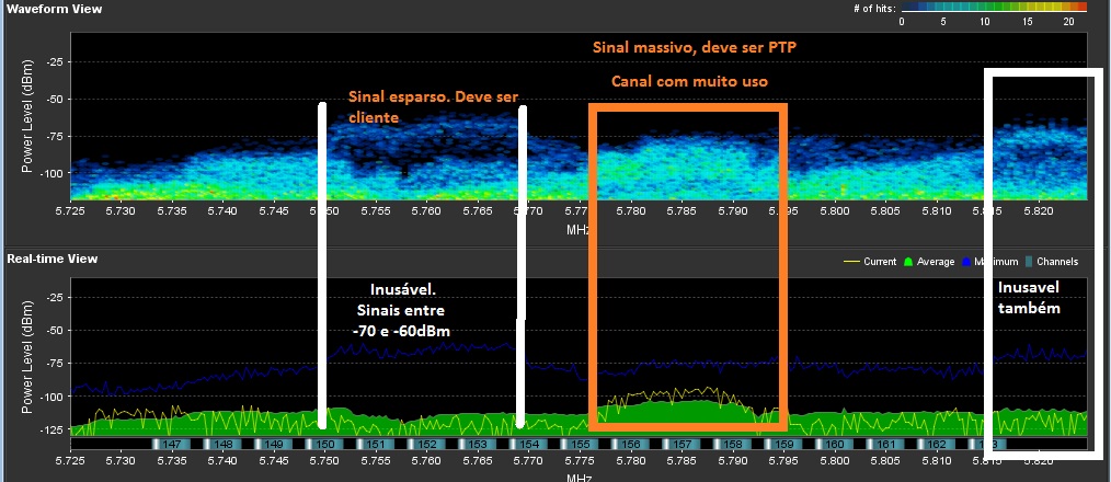 No waveform view a MÉDIA de hits é baixa, mas é porque um cliente não transmite o tempo todo, é uma rajada de 2 segundos e depois fica uns segundos sem trocar nada de dados. Isso ia fazer o PTP variar de throughput, aqui já ví coisa tipo cair pra 5Mbps a cada poucos segundos, e ficar mais ou menos estável nuns 50-60Mbps o resto do tempo. Escanear SSID nessa hora não ajuda, se é cliente de outro provedor (Ou do seu mesmo) só vai aparecer sinal alto hora que ele estiver transmitindo (E ligado! Muita gente desliga CPE a maior parte do dia). Por isso é fundamental rodar o AirView alguns minutos pra entender bem que tipo de incômodo tem, wifi não é transmissão contínua, se o usuário não navega aparece poucos hits, mas se tem poucos hits AGORA não quer dizer que não terá centenas deles daqui umas horas quando o usuário dessa antena (Que emite de modo que chegue com sinal -60dBm) começar a trocar mais pacotes.