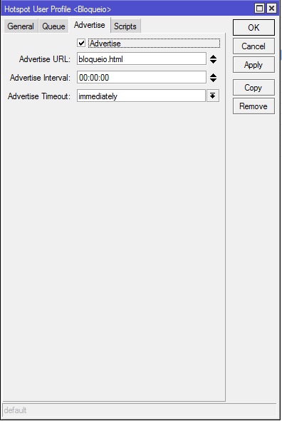 IP>HOTSPOT>USER PROFILES>ADD>GENERAL ''NOME: BLOQUEIO''>ADVERTISE>>>
