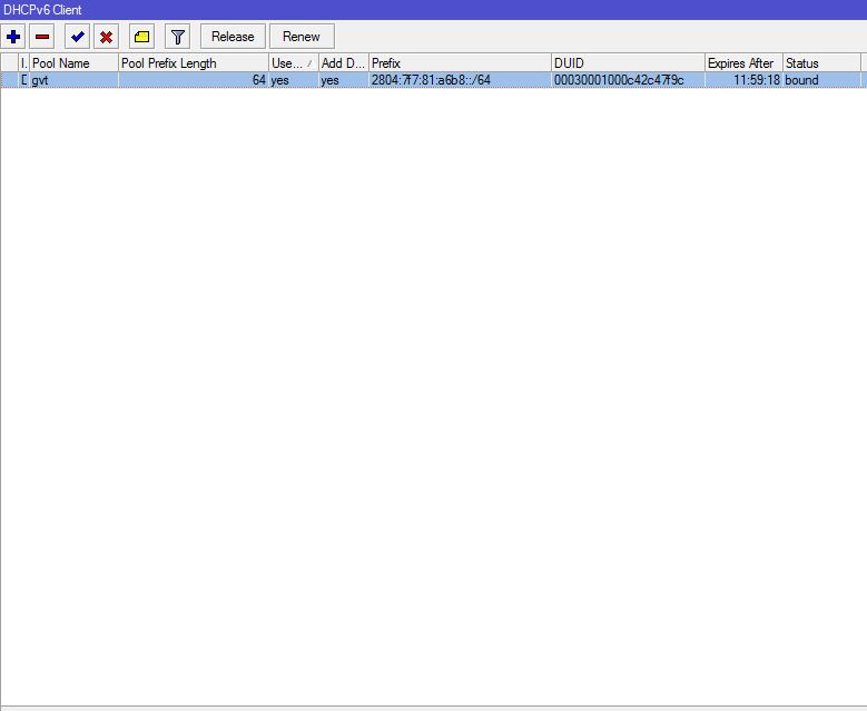 Eu já crie, recebo um bloco de ipv6 na foto em anexo, só que infelizmente está em /64 e não estou conseguindo fazer o pool repassar para os clientes em pppoe