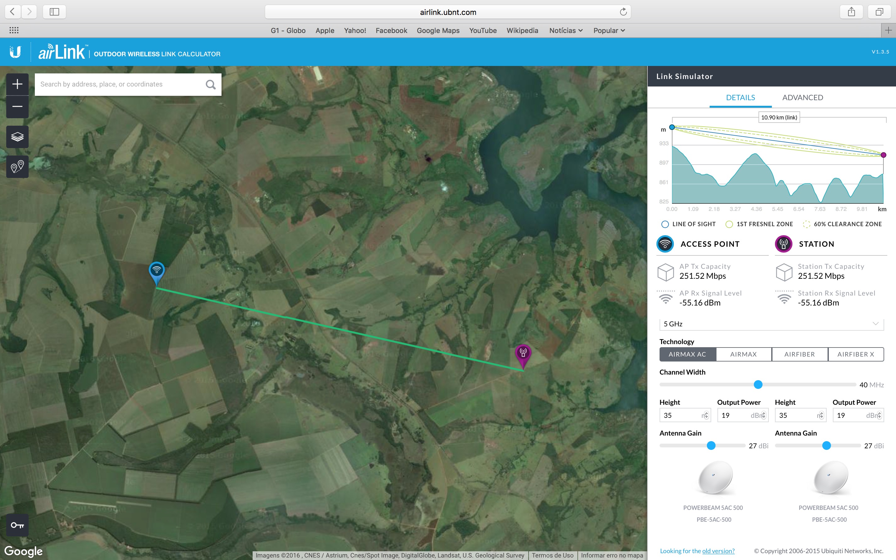 - O terceiro enlace seria dessa torre até outra torre de 40 metros, em outra fazenda, também sem energia elétrica no local. Nesse caso pensei em usar PowerBeam 5ac 500, sem radome pois no local acho pouco provável que sofrerei interferência, enlace de 10.9km.