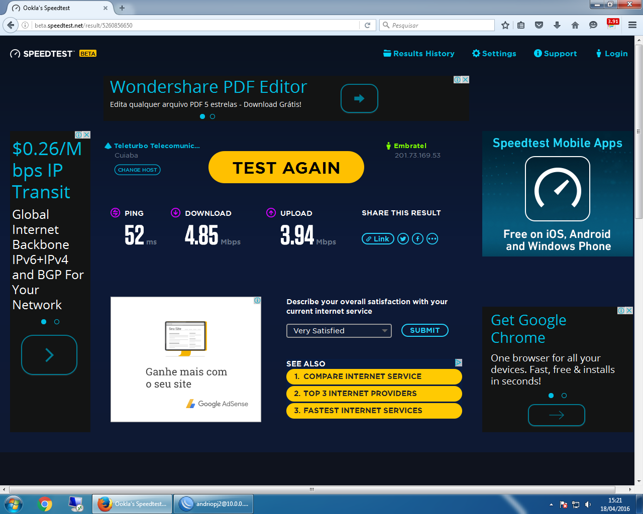 Medição velocidade = Down 4.85 Mbps, UP 3.94 Mbps
