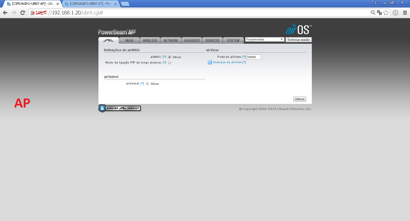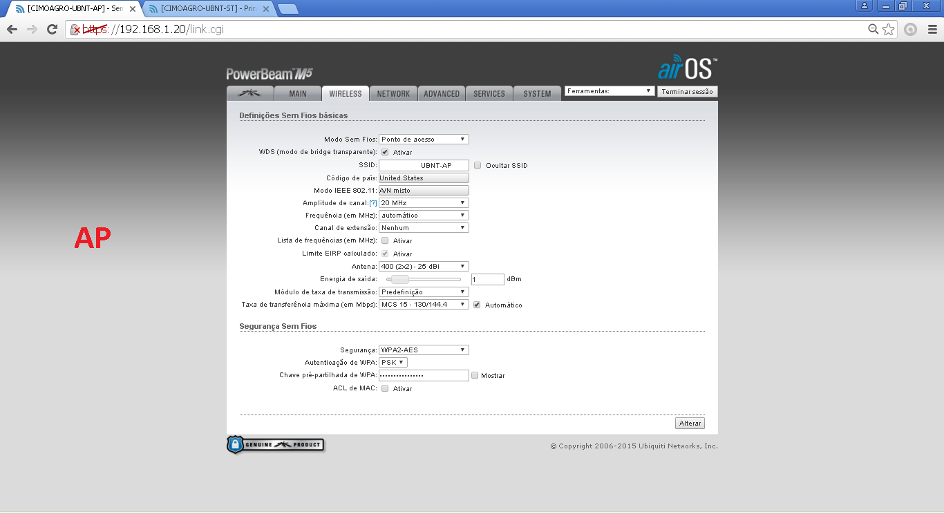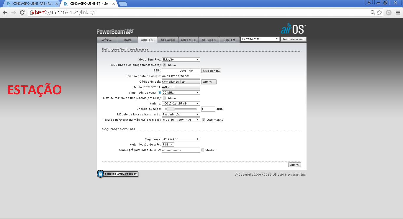 Este ponto a ponto utilizo para trafegar dados entre 2 escritórios. Abaixo estou enviando os prints do AP(escritório matriz) e da estação (escritório novo a 600mts).
