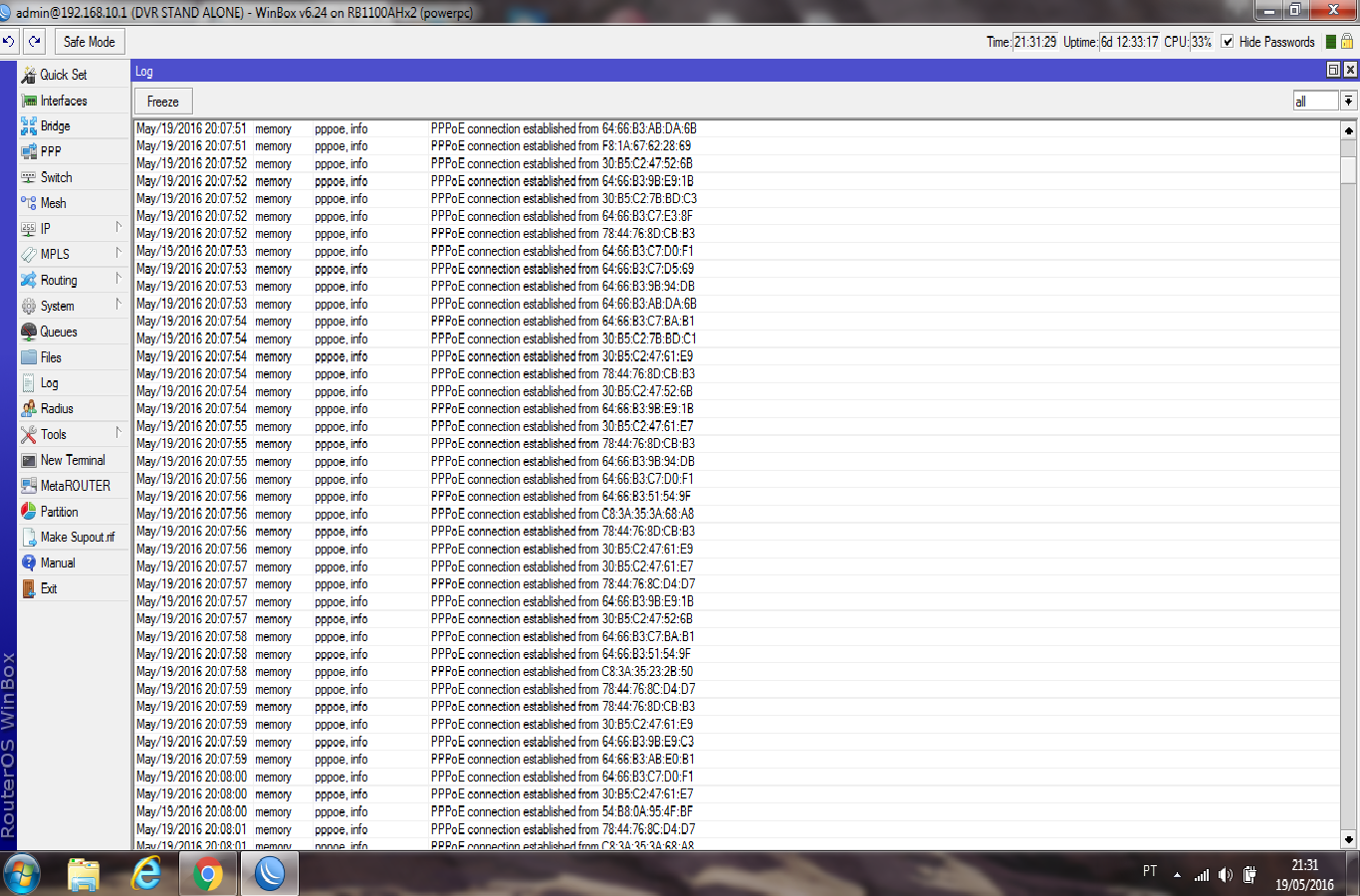 Estou eu a monitorar minha rede, do nada, percebo que o trafego diminui, vou ver o que é, metade dos clientes PPPOE desconectados. Eles desconectam e logo após reconectam. Alguns ficam distantes uns dos outros, alguns da rede cabeada outros da rede wireless. Exemplo: Sergio utiliza no cabo e caiu neste momento, Claudio vizinho dele continua logado(e provavelmente utilizando normalmente). Estou sem entender isto, alguns deslogam e relogam, outros continuam navegando "normalmente", alguns são no WIRELESS, outros na rede cabeada.