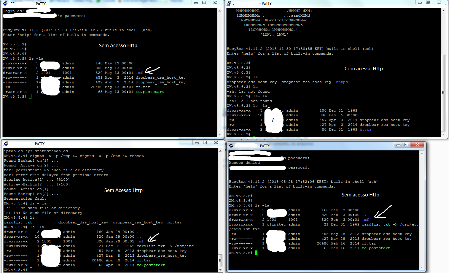 via SSH eu dei o comando ls -la e percebi que essas antenas continham arquivos diferentes, segue print abaixo comparando uma antena não infectada com versão 5.6.x e 3 antenas infectadas com versão 5.5.x:
