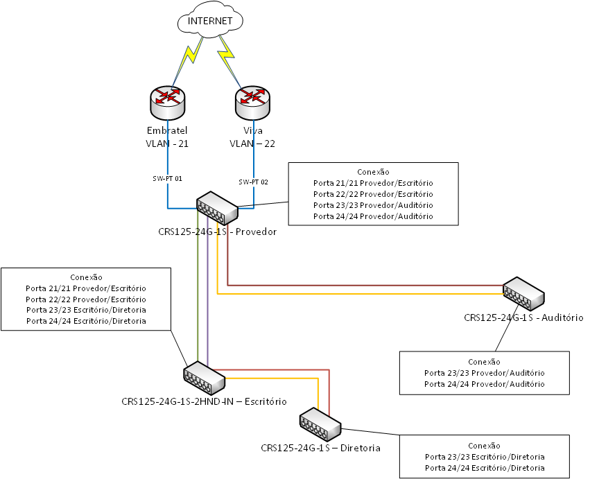 Estou precisando de ajuda para solucionar alguns problemas, abaixo segue o diagrama da minha rede, fiz uma rede com TRUNK e VLANS utilizando o sw crs125-24G com mikrotik, mas encontrei algumas dificuldades para solucionar alguns problemas, segue a lista;