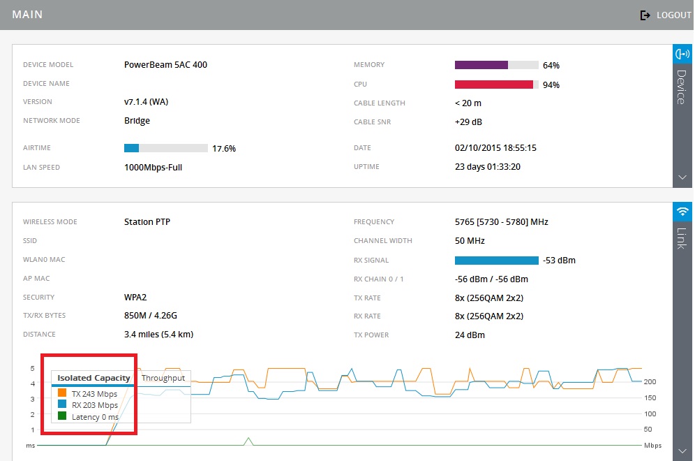 o que acho estanho nos enlaces ac da UBNT, é o processador que esta sempre topado. Acho que passar um trafego de 80M o enlace para. Isso não acontece com os MK.