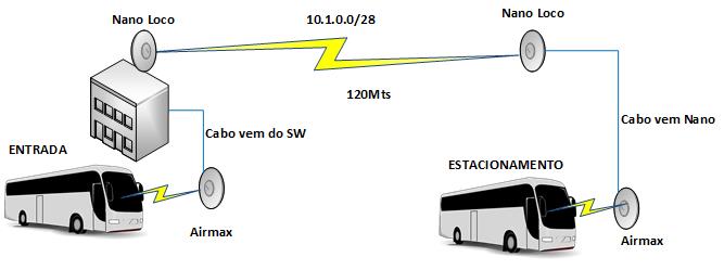A empresa precisa fazer atualizações nas catracas eletrônicas quando os ônibus chegam a garagem. O cliente adquiriu dois ddddax Nanobeam M5 afim de que eles retransmitam por wifi as atualizações. Um dos equipamentos ficará próximo a central e será ligado por cabo de rede ao SW, e o outro ficará cerca de 120 metros de distância da central na garagem realizando o mesmo trabalho de sincronização dos dados. Porém não existe a possibilidade de ligar a outra antena no SW devido a restrições físicas na empresa. Mina dúvida é a seguinte, como o cliente comprou esse equipamento para apontar apenas para os ônibus poderia colocar mais duas antenas para realizar essa ligação? Me desculpem a dúvida um tanto quanto banal para alguns, porém não tenho muito conhecimento em redes wifi ponto a ponto, e também não quero simplesmente fazer serviço de qualquer jeito. Abaixo segue um projeto rápido de como pensei em fazer, e gostaria de saber se é possível seguir por esse caminho. Agradeço a atenção de todos!