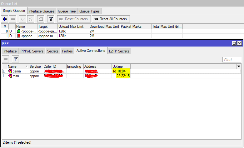 Eu estava acompanhando o andamento das conexões, e percebi que no usuário rosa havia caído o pppoe, ai deixei passar... No outro dia fui ver as logs da RB e vi que o pppoe dela não estava ativo, então fui na casa da mesma e vi que o roteador estava desligado. Concluindo, muitas das vezes pensamos que é alguma problema de configuração ou cabeamento que também não deve ser desconsiderado, mas também o usuário apenas desliga o roteador para utilizar a tomada para outras coisas, ou por questão de motivos pessoais.