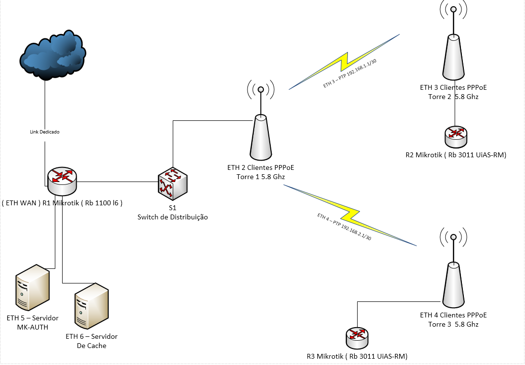 Olá amigos estou fazendo um projeto em minha cidade e a intensão e retirar os equipamentos da linha M5 da ubiquiti e colocar toda rede em AC. Criei essa topologia "Start", básica ,(Em construção) e estarei implementando mais detalhes ate ter um resultado satisfatório. Hoje tenho um link de 50 Mbps full e nessa implementação quero chegar com 500 Mbps ate fim desse ano. na minha torre 1 recebo o link tenho um servidor MK-AUTH e um servidor de cache rodando nesse cenário novo. na torre 2 tenho uma 3011 e na torre 3 uma 3011 para autenticar os clientes a duvida e a seguinte: compensaria investir em três 1100 L6 ou uma ccr1016 ? estou deixando meu post para curiosos e para quem tem a vasta experiência dar uma forcinha. um abraço a todos e fiquem com Deus. Obs: Usarei Rocket AC PTMP AirPrism Nos Aps e Lite Beam AC x NanoBeam Ac nos clientes sendo uma rede toda MIMO. Grato