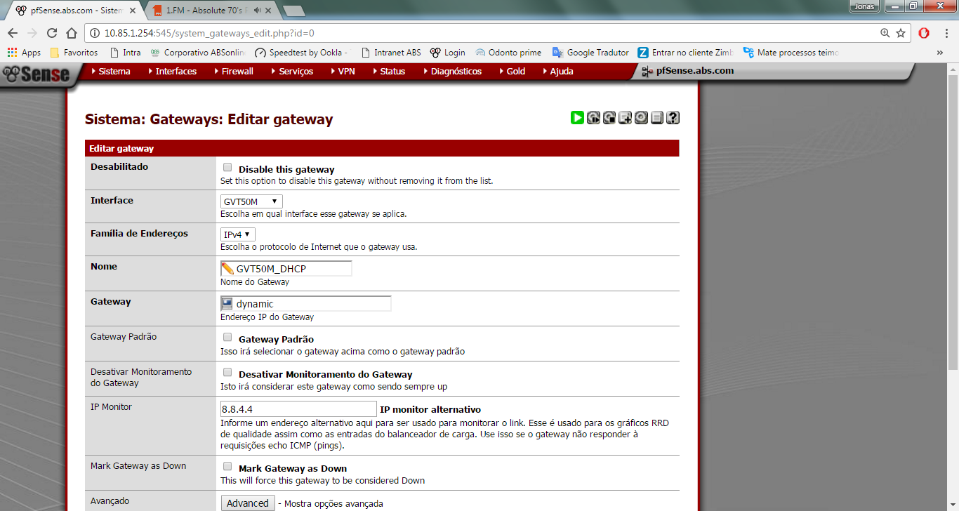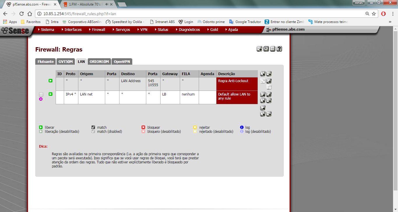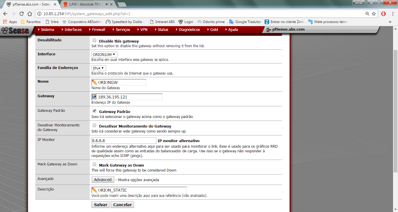 Sou iniciante no pfsense, ja fiz cursos etc.. sou TI de uma empresa que tinha 03 TIs de suporte par atender 100 PCs cheios de problemas!! Saiu todo mundo e fui contratado para assumir por aqui somente eu. São muitos "buchos" diariamente para resolver todo tipo de problema e não tenho tempo para me concentrar e estudar as coisinhas. O seguinte fiz um LoadBalance com Failover seguindo varios tutoriais na Net, mas não esta funcionando. Quando cai um link (VIVO) o outro link (Orion) não sobe. Anexo estou enviando as imagens da minha configuração. Não uso Proxy nas maquinas. Desde já agradeço a ajuda que por ventura venha a mim.![]()