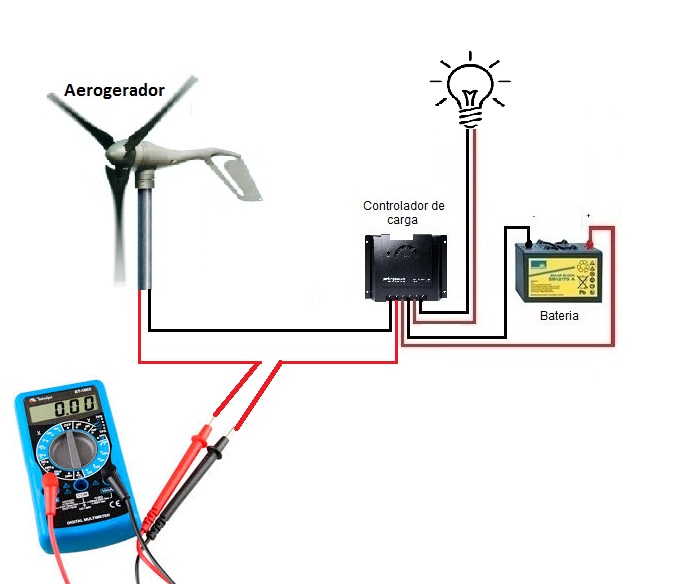 O jeito de medir é colocando o amperímetro em série, entre o aerogerador e o controlador de carga: