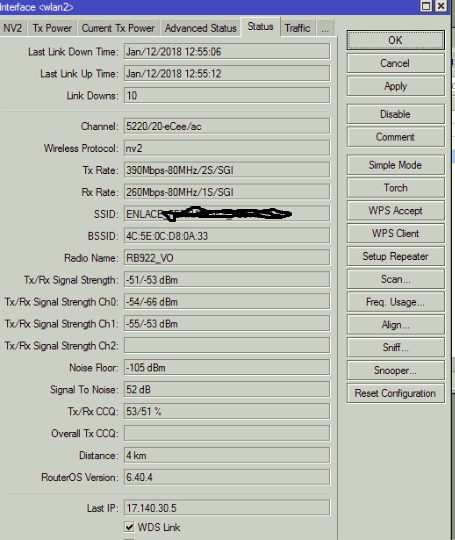 Bom dia, olhamos nas torres e o enlace aparentemente está ok, e também mexi novamente nas configurações, mudei em várias frequências, deixei em 20/40mhz, mudei alguns mcs, porém aquela diferença de rx continua a mesma. segue a imagem.