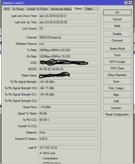 Explico. Desalinhamento reflete em nível de sinal recebido, Obstrução de alguma zona de Fresnel, com excepção da segunda, também. Se observar no nivel RX , ele tem sinal suficiente para um bom enlace. Devido à interferência os pacotes não conseguem ser discriminados e são obrigados a retransmitir. Isso se traslada em aumento de CCQ. O CCQ indica percentual de pacotes que são aceitos na primeira transmissão.