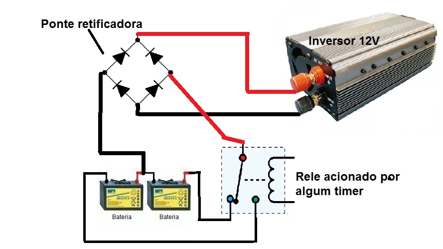 Ponte retificadora de 50A é baratinha (Exemplo: https://produto.mercadolivre.com.br/...penas-r650-_JM ), é só parafusar num dissipador de calor decente e pronto. Depende do consumo do inversor, essa de 50A eu também não usaria pra consumo maior que uns 200W. O rele pode ser qualquer automotivo que tenha pino NA e NC (Tem que ser aquele com os pinos 87 e 87a, não serve o com 2 pinos 87. Um que serve: https://produto.mercadolivre.com.br/...0a-5-pinos-_JM Só que seria bom limitar eles nuns 15A ou menos, são baratos porque são lixo, ou coloca 2 em paralelo ou acha um mais parudo (https://produto.mercadolivre.com.br/...automotivo-_JM).