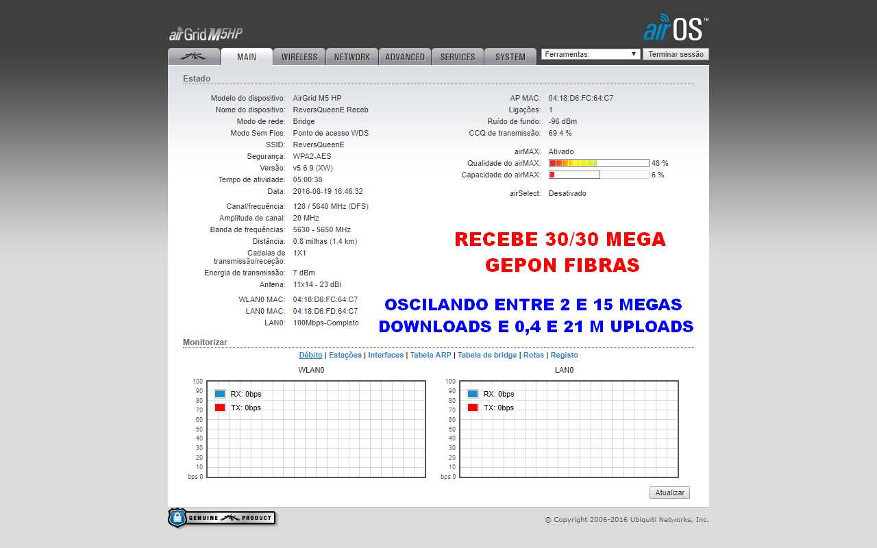 os sinal dos radios tao muito ruim. falta alinhamento ou.visada com essas airgrid para conseguir uns 30mb teria q conseguir um sinal na media de -50