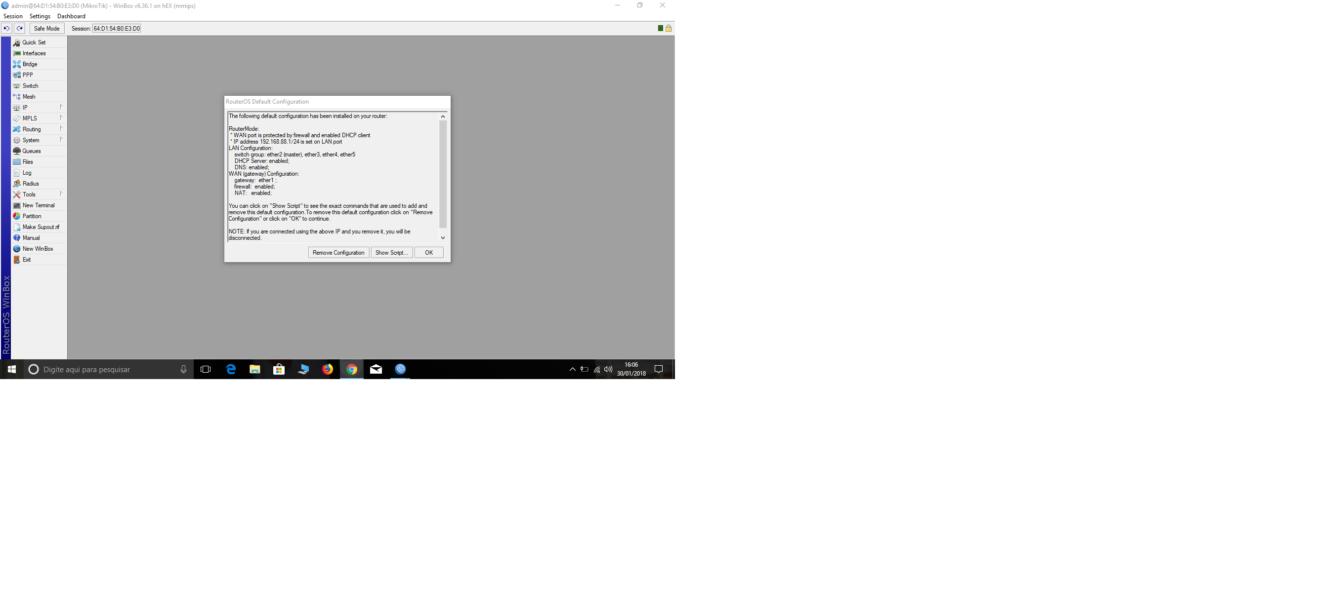 Essas são as configurações padrões que veem em qualquer roteador da Mikrotik, você pode remove-la clicando em Remove Conf, após remover seu acesso ao roteador ira cair, aguarde alguns segundos e pode acessar novamente e o roteador vai esta com 0 configurações.