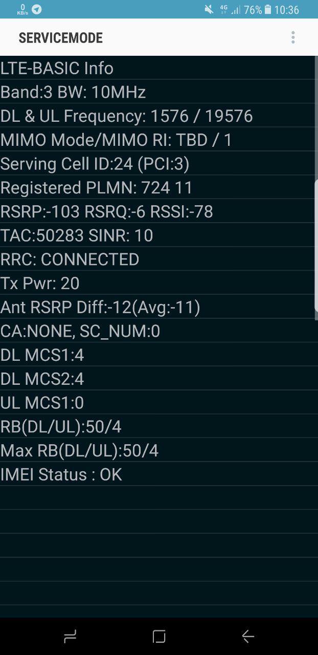 Neste print o sinal é de -103dBm. Ruim mas ainda assim utilizável devido a sensibilidade das ERBs. Status do 3G+4G= CONECTADO