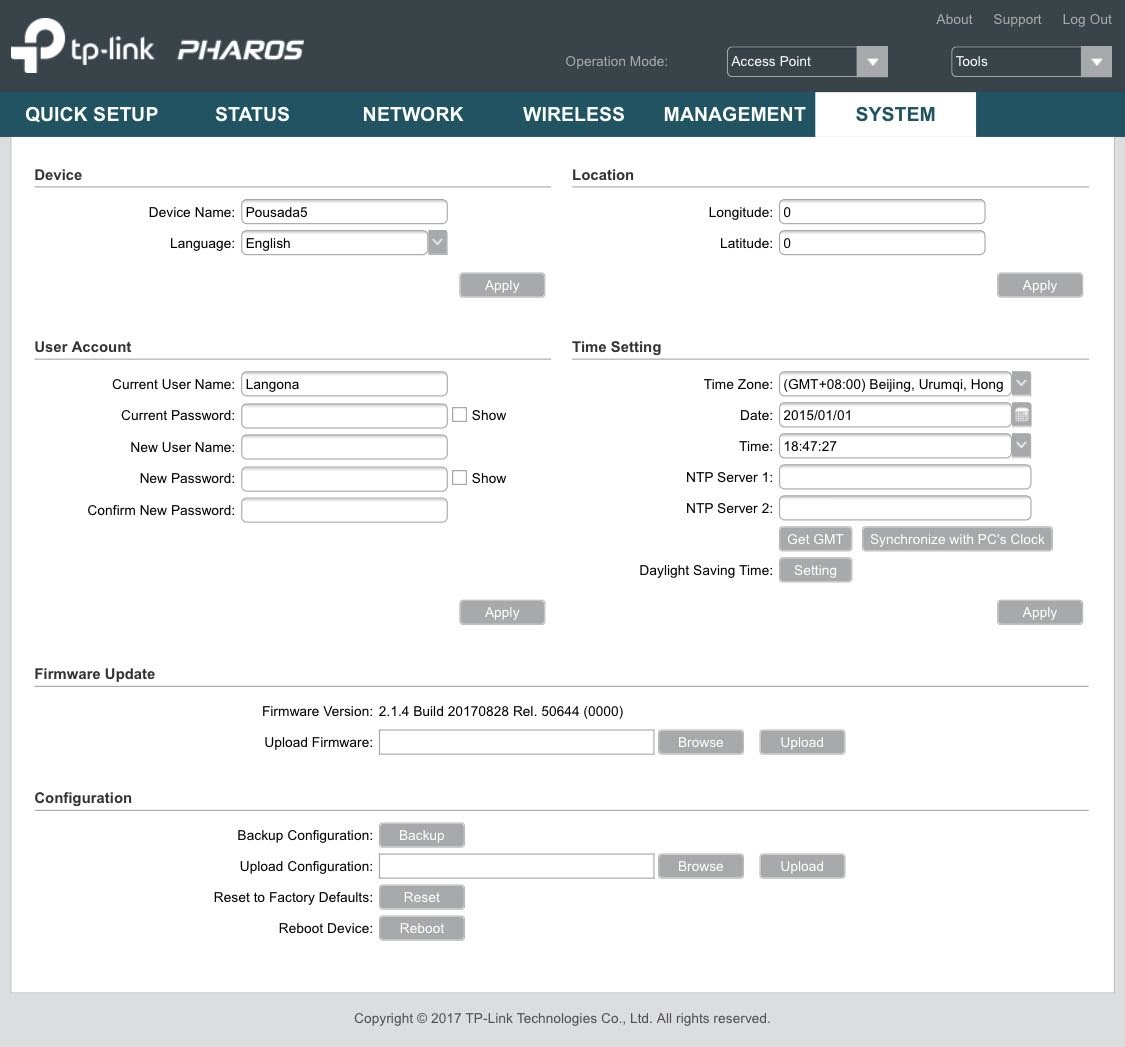 Screens de um dos APs (tive que desligar o Mikrotik para poder ter acesso ao Access Point via Wireless e poder acessar o menu dele)