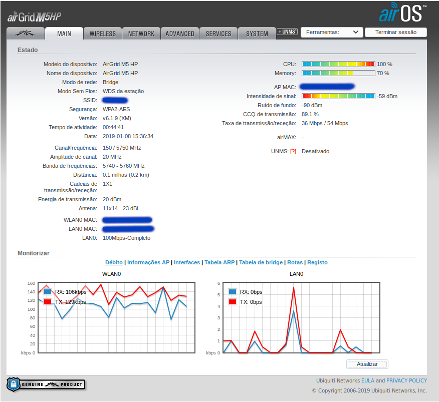 Boa noite! Caso esteja fora dos requisitos ou no lugar errado para este post, desculpe-me. Minha rede eh o seguinte, tenho o modem ADSL com ip 192.168.1.1, roteador Tp-Link 192.168.2.1, Nano Loco 192.168.2.201 "Configurado em bridge", Airgrid M5 HP com WLAN 192.168.2.206 "configurado em router". Ja mudei potencia de saída, frequência do canal e mesmo assim o CQC continua oscilando e muito, ja verifiquei se existe alguma coisa na frente, nao tem, distancia entre os pontos eh de 187m.