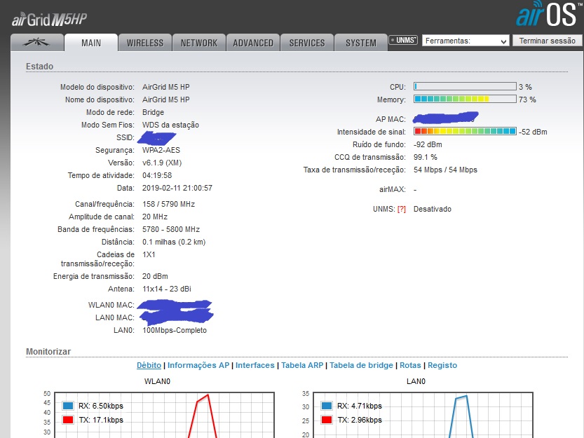 Procurei sobre Airview aqui no fórum, saber como que fazia leitura do mesmo e etc. coloquei ele "5790", desci um pouco a antena Airgrid e virei mais um pouco para às 15h, puxei o fio de sustentação da barra de ferro do nano para aumentar alguns graus inclinação do mesmo... agora os print com os parâmetros, CQC oscilando como antes, 98~99%.