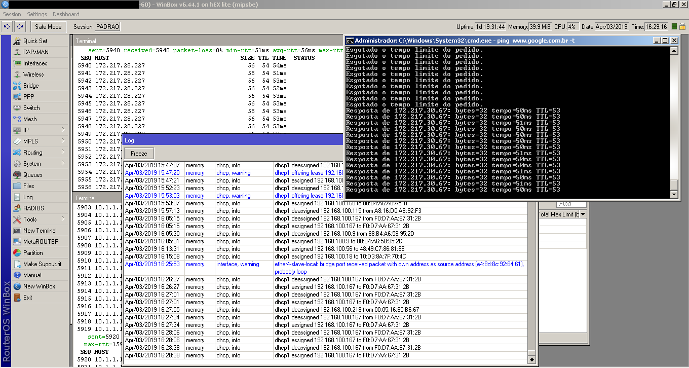 Erro: mar/31 23:47:41 interface,warning ether4-slave-local: bridge port received packet with own address as source address (XX:XX:XX:XX:XX:61), probably loop