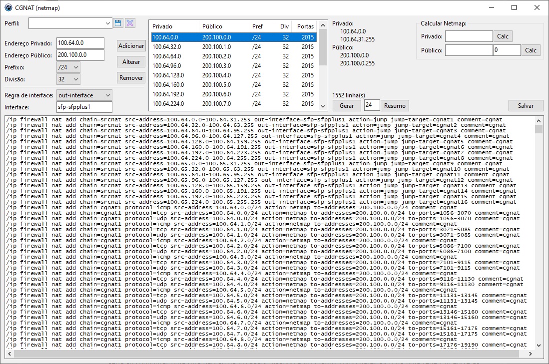 Você pode criar vários perfis de conjunto de regras e deixar gravado com um nome específico. Por exemplo, um perfil para cada roteador que faz CGNAT, com endereços diferentes.