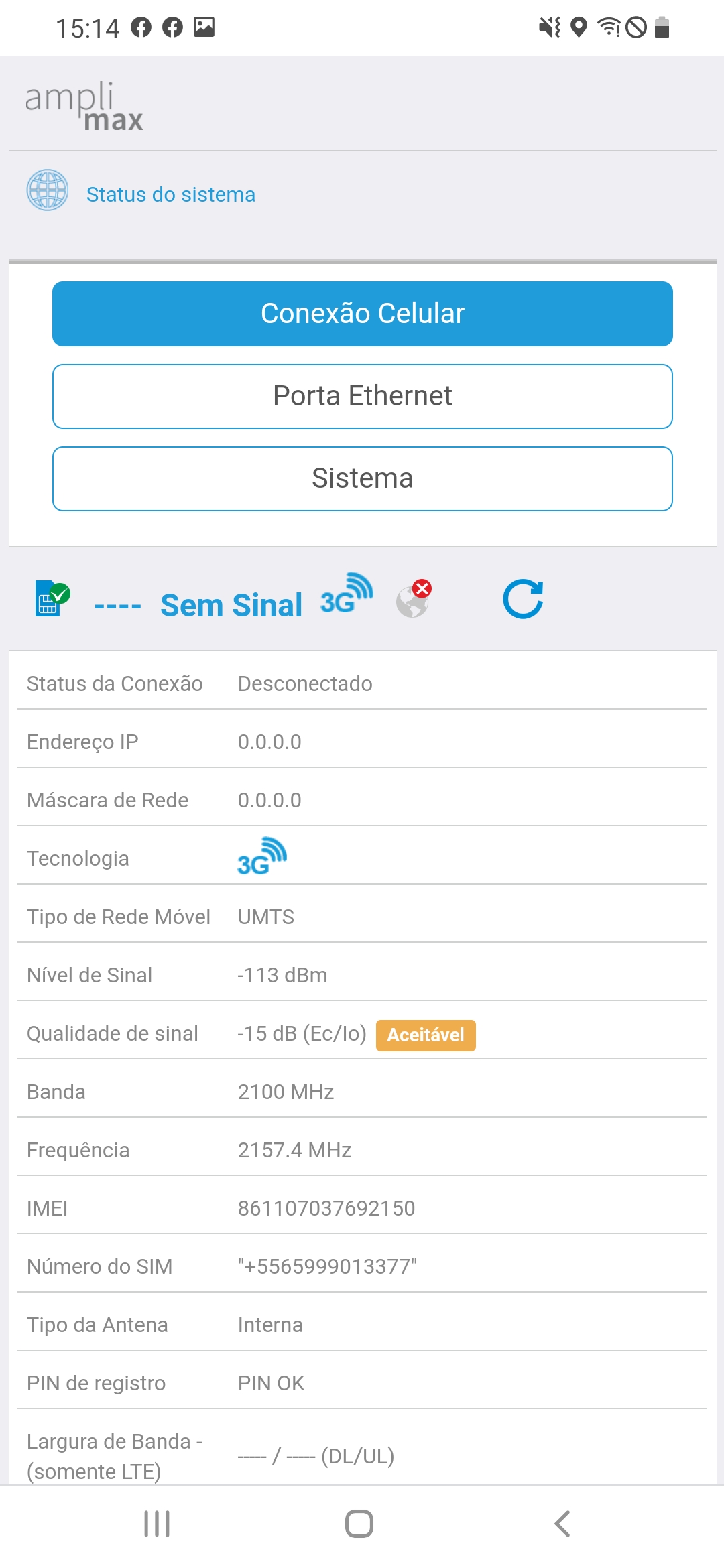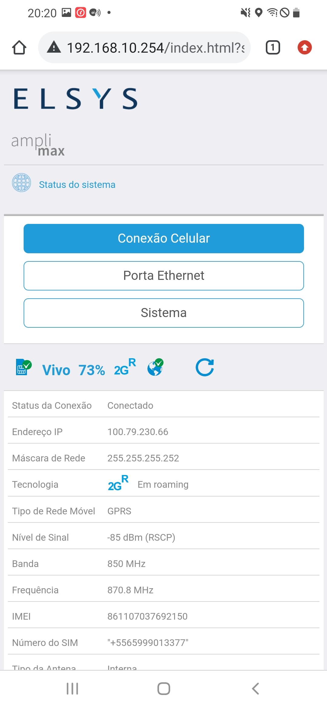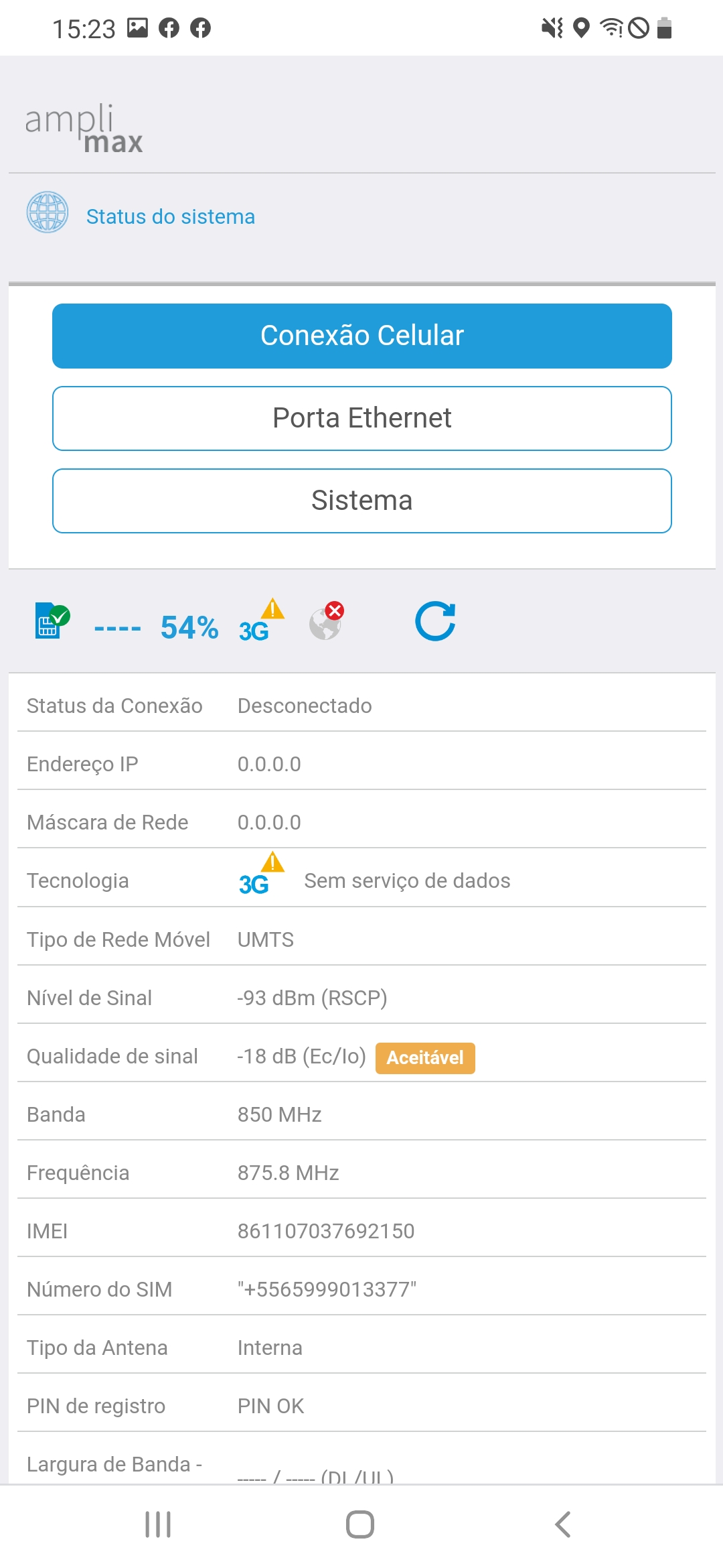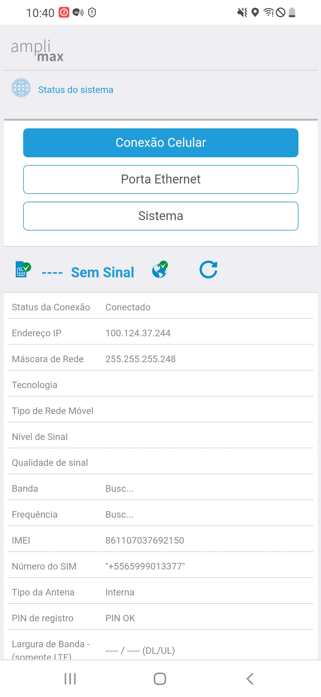 Um teste válido, é acessar o IP do Amplimax, ir na Opção Status do Sistema, e verificar os pontos de Endereço de IP e Mascara de Rede, se estes campos estiverem zerados, sua operadora não está distribuindo rede para seu chip.