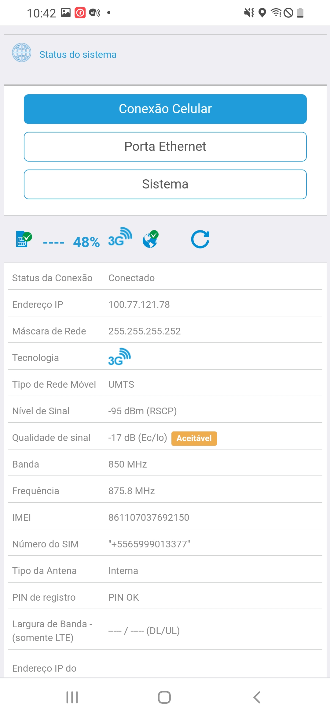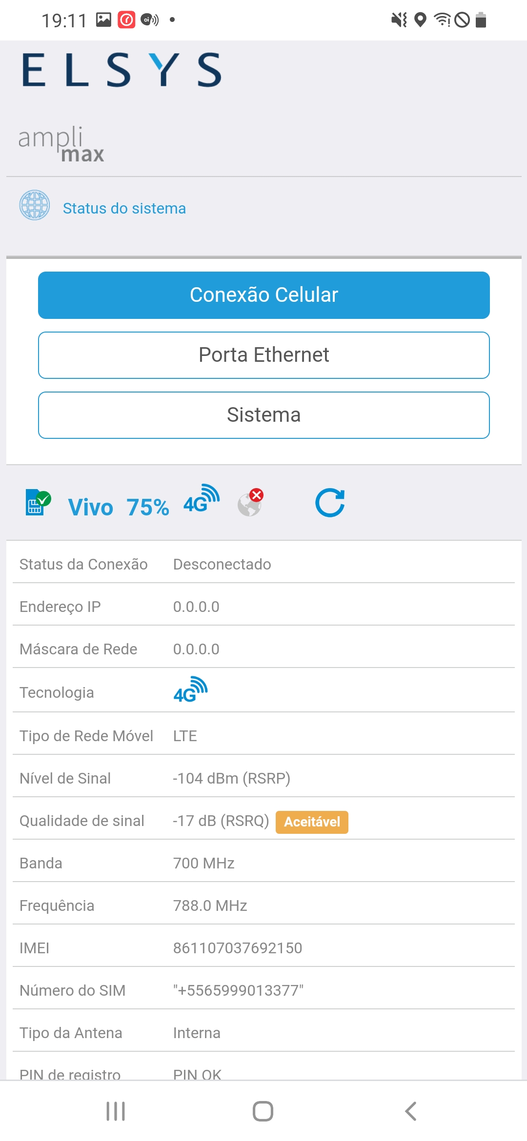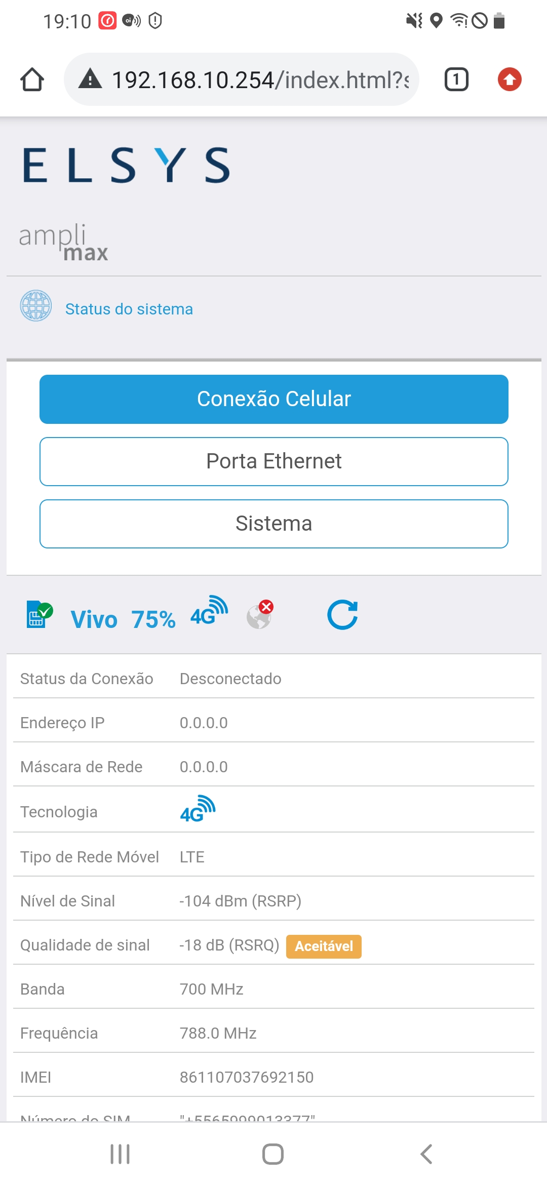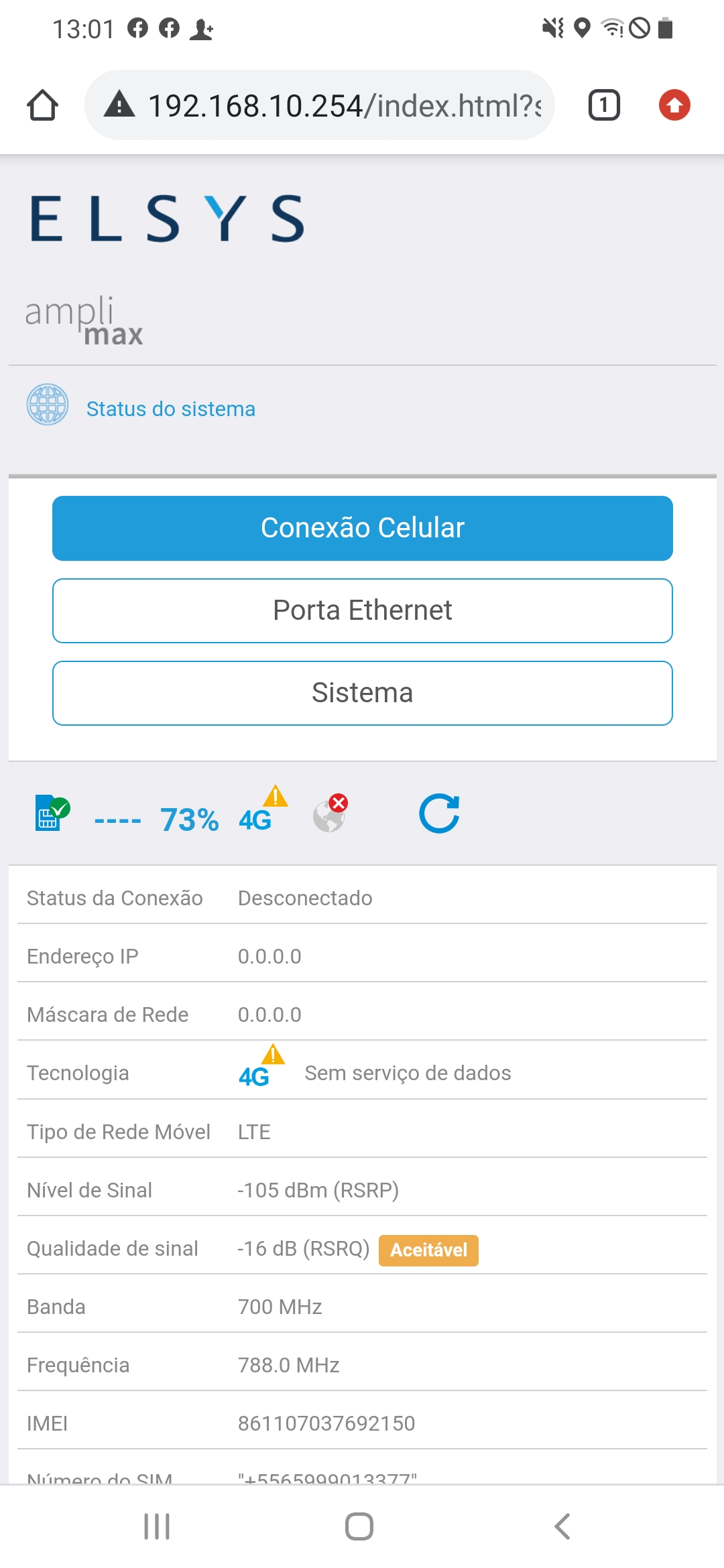 Um teste válido, é acessar o IP do Amplimax, ir na Opção Status do Sistema, e verificar os pontos de Endereço de IP e Mascara de Rede, se estes campos estiverem zerados, sua operadora não está distribuindo rede para seu chip.
