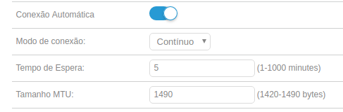 O campo Tempo de Espera, no menu Configurações de Conexão, é imutável. O campo vem configurado com o valor 5 minutos e não há como alterar, independente das demais configurações (Manual ou Contínuo).