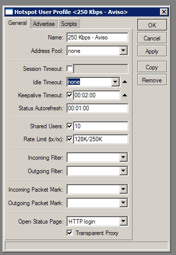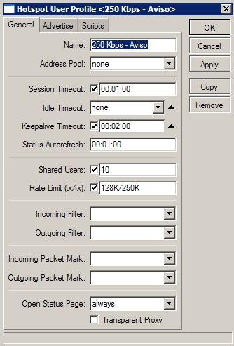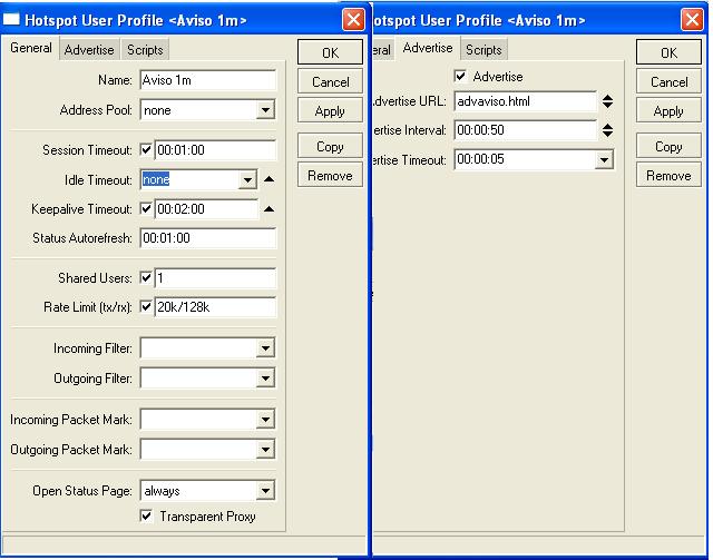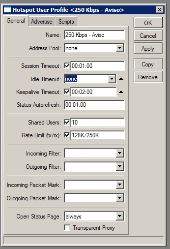 add name="Aviso" session-timeout=1m idle-timeout=none keepalive-timeout=2m status-autorefresh=1m shared-users=1 \