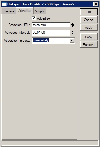 e por ultimo em vez de 1min em advertise interval coloque 50sec se vc que um tempo de 10sec para advertir o cliente 55sec se vc que um tempo de 5sec para advertir o cliente ou 40sec se vc que um tempo de 20sec para advertir o cliente e assim por diante eu uso em advertise interval 50 que da um intervalo de 10sec para mostrar a mensagem para o folgado, tenta ai e posta pra nos