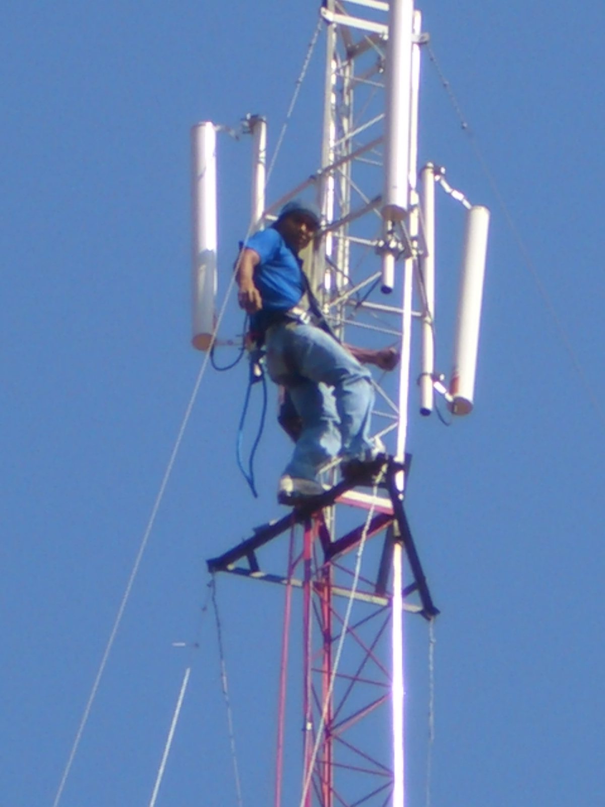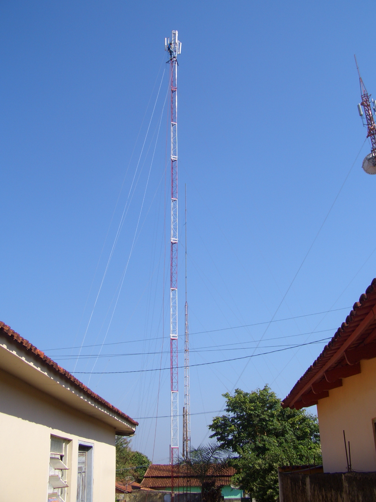 Tem 33mt de altura, um sistema de anti-torção na ultima parte, cada estagio tem 3mt, presa com cabo de aço 5mm e esticadores 3/8.