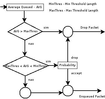 Este efeito é obtido controlando o tamanho médio da fila de espera no roteador, este é comparado a dois limiares (threshold), um mínimo e um máximo.