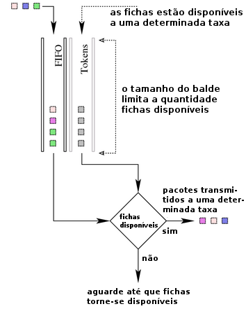 A implementação do TBF consiste em um buffer (bucket), o qual está sempre sendo preenchido por pequenos pedaços virtuais de informação chamado tokens. Cada token que chega recolhe um pacote de dados de uma fila de dados e é repassado a rede, em seguida é deletado do bucket. O mais importante atributo do bucket é o seu tamanho, que é a quantidade de tokens que ele pode armzenar.