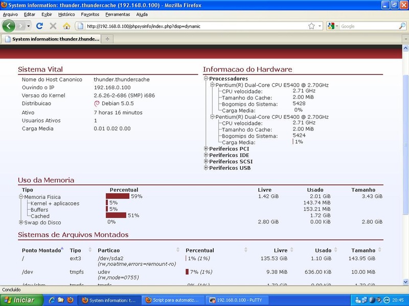 Opa RobertoLima, é o Debian sim, mas é que não entendo nada de linux e gostaria de aprender a montar esse serrvidor, baixei tudão, funfou legal, fez um monte de download e tal, reiniou tudão ficou bacana, agora se você puder me explicar o q é q tem q ser mudado no thunder.conf e no thunder.php eu ficaria muito agradecido, só mais uma coisa se não for pedir muito, como faço pra fazer a conexão passar por ele ou seja tenho 2 olacas de rede uma ta ligada nele q é da net, e a outra como faço pra q saia dela e passe pras outras máquinas, como faço pra configurar a outra placa de rede? se puder me ajudar ficarei muito agradecido.
