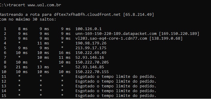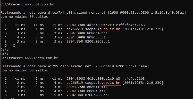 Perceba que a rota já é IPV6 e tem um mínimo de saltos até chegar ao destino passando pelo Ponto de Troca de Tráfego de São Paulo direto até o servidor do UOL.