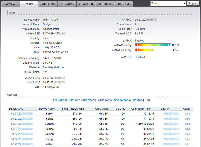 Neste tempo todo o Bullet M5 da torre reportava airMAX Quality por volta de 96% e airMAX Capacity: 48% . Onde toda linha M5 ficava com 99%/49% enquanto a Nano 5 ficava 95%/46%.