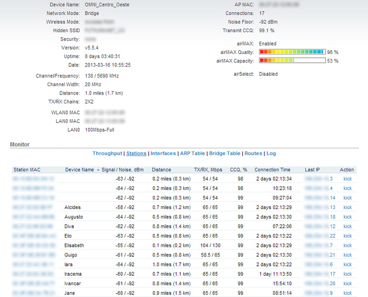 "Mais" porque a partir do momento que eliminei a última Legacy, meus parâmetros airMAX em todas as estações ( e logicamente no Bullet M5 ) cravaram em 100%/50% respectivamente. Lembrando que mesmo os M's antes, quando ainda juntas com Legacy's não ficavam "100%".